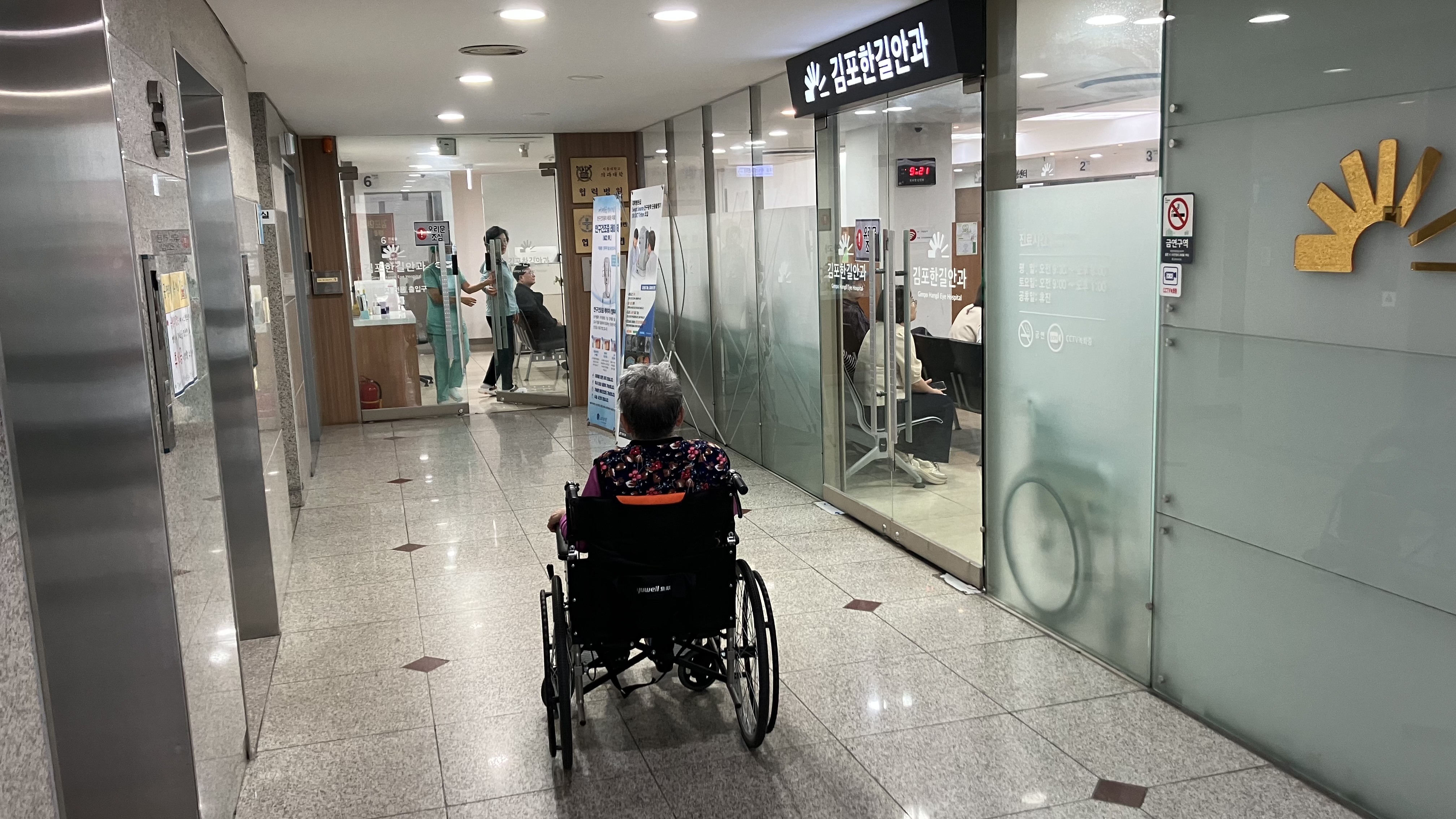 작은형의 한마디에 뇌리 한구석에 번쩍 불꽃이 튀었다. 나는 김포 안과병원에 전화를 넣었다. 어머니는 7년 전 오른 눈을 백내장 수술하셨다. 오월이 다 갈 즈음, 형제는 어머니를 모시고 안과병원을 찾았다. 어머니는 자식들이 고생할까 염려되어 당신의 불편을 숨겨왔다. 의사가 탓했다. “왜 이제 오셨어요” 어머니의 왼쪽 눈은 백내장이 너무 심해 아무것도 보이지 않았다. 수술예약 환자가 나래비를 섰다. 한 달 뒤, 수술 일정이 잡혔다. 의사는 수술 성공확률을 90퍼센트로 잡았다. 자괴감이 몰려왔다. 위 이미지는 두 번째 통원치료일, 병원에 들어서는 어머니 뒷모습이다. 병원에 갈 적마다 나는 전날저녁 휠체어를 차 트렁크에 실었다.