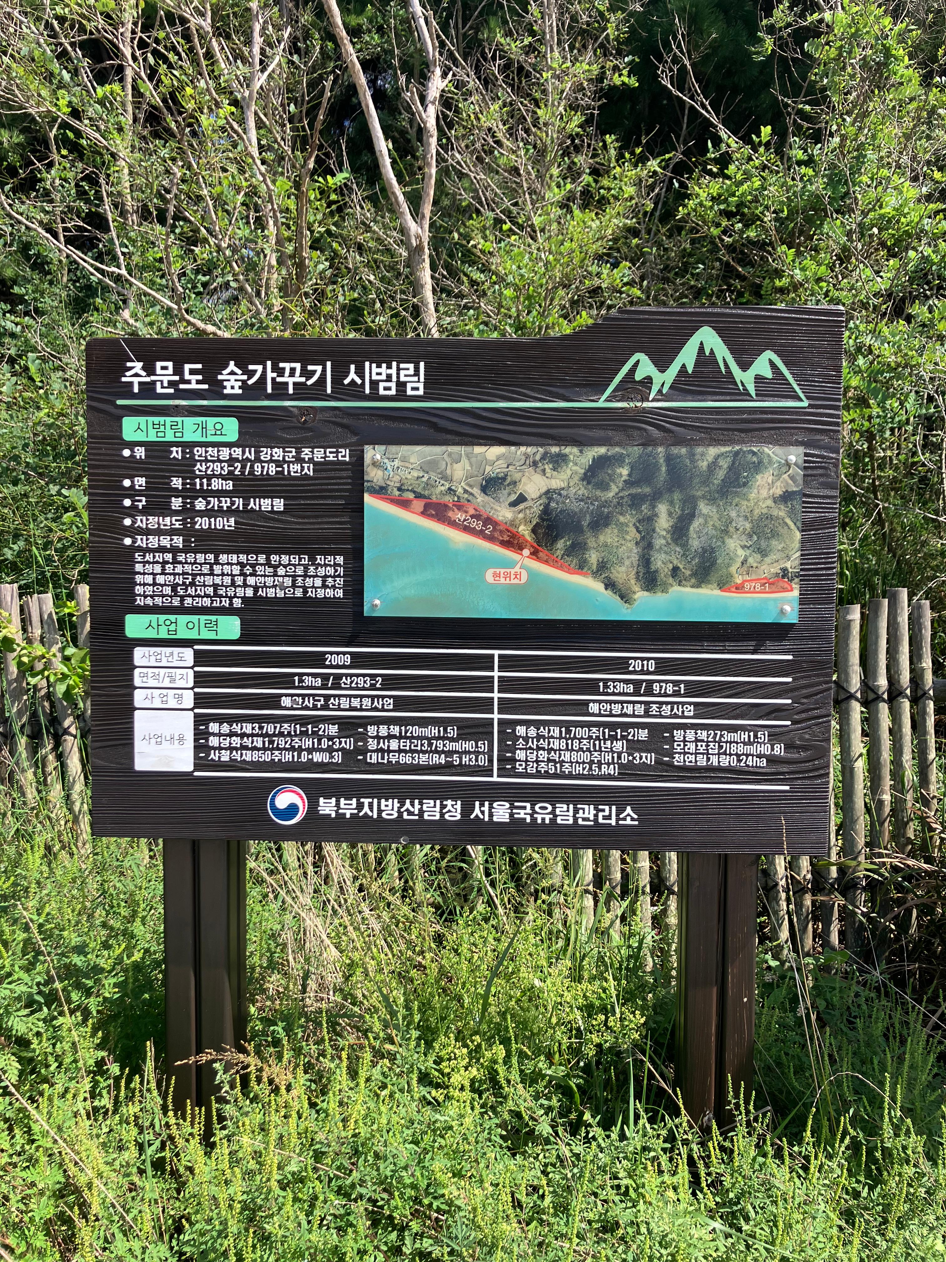 ‘주문도 숲가꾸기 시범림’은 대빈창 해변에 2009년도에 해송·해당화·사철나무를 식재하고, 방풍책으로 대나무 울타리를 세웠다. 2010년도에 해송·소사나무·해당화·모감주나무를 식재하고, 방풍책과 모래포집기를 설치했다. 주문도 봉구산 숲은 소나무와 참나무의 주종 혼합림이었다. 나는 어머니를 모시고 2008년 초겨울 느리 마을에 삶터를 꾸렸다. 두서너 번의 간벌로 기억되는 ‘숲 가꾸기 사업’은 그다지 특별할 것이 없었다.