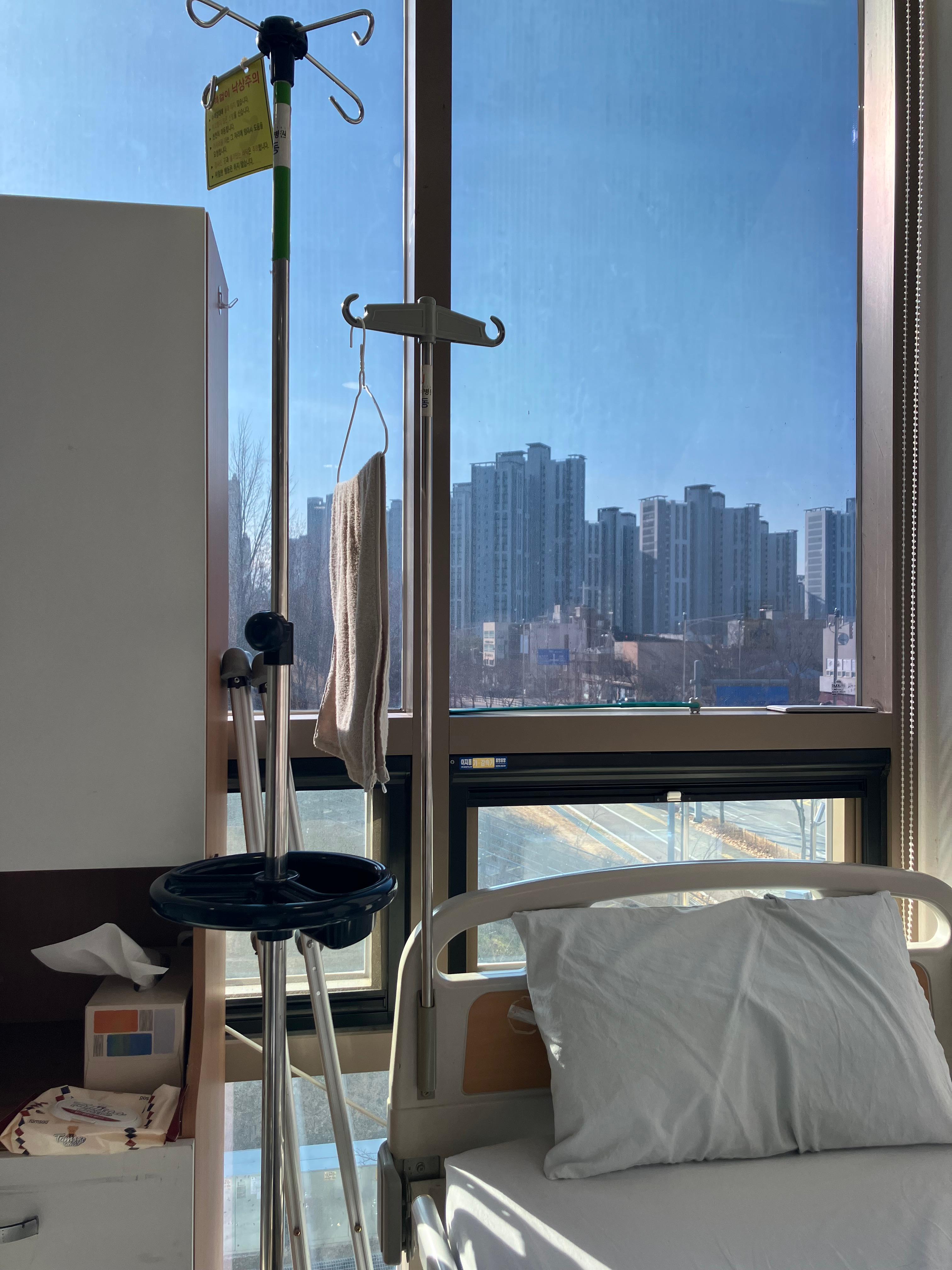 8개월 전의 김포 소읍의 정형외과 2차병원에 다시 입원했다. 오후에 무릎 반월연골판 봉합 재수술을 받았다. 왼손에 링거를 매달고 왼발을 휠체어 발걸이에 올려놓고 이동하는 불편하기 짝이 없는 입원생활이 시작되었다. 작은형은 인천집과 병원을 오가며 동생의 병수발을 들었다. 이미지는 병실 창가 나의 침상이었다. 3월 수술은 5일 만에 퇴원했다. 나는 조심할 수밖에 없었다. 재수술후, 3주를 채우고 무릎보조기의 각도를 완전히 꺾고 퇴원했다.