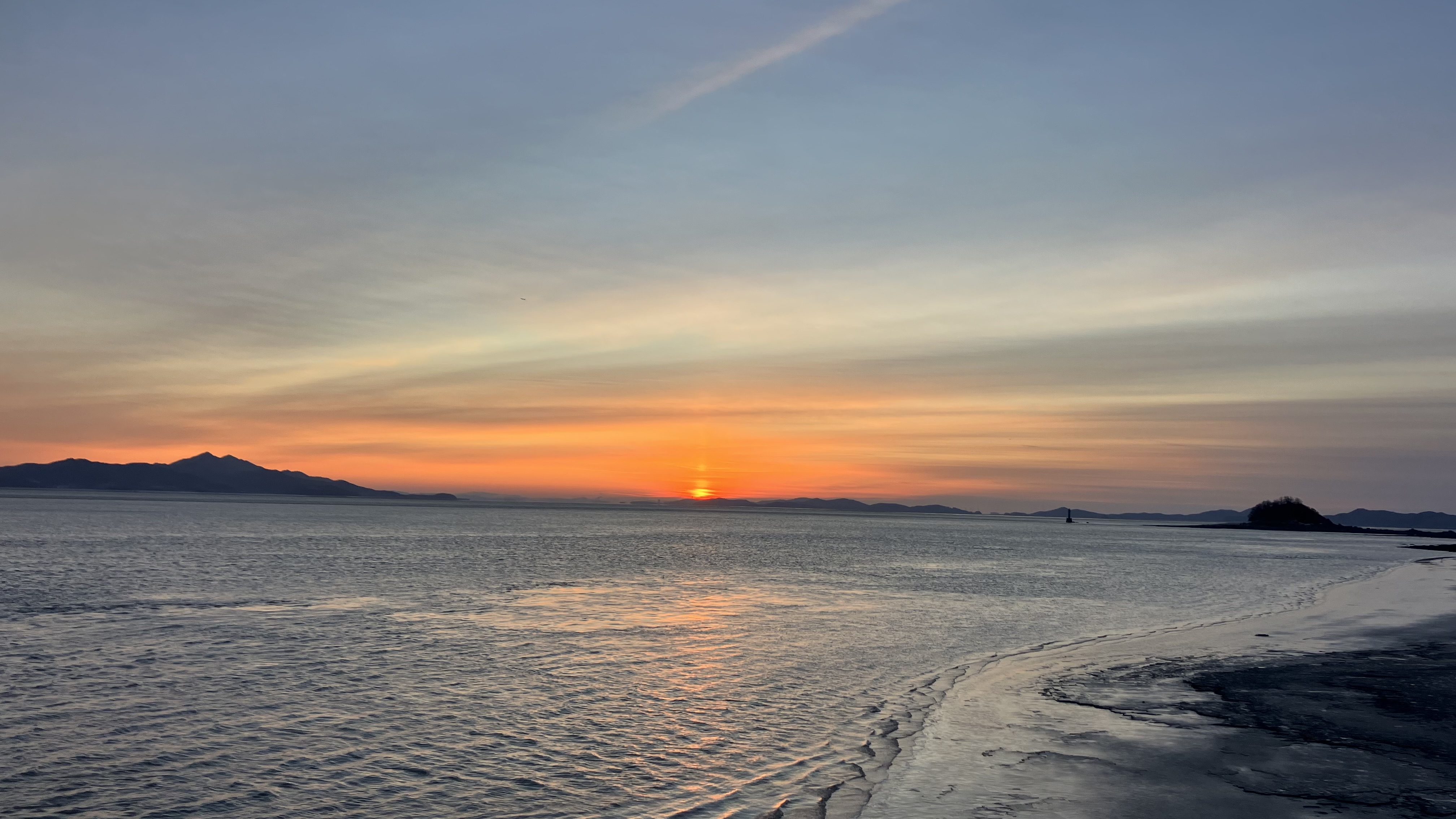 황해의 작은 외딴 섬 주문도의 해돋이 시각은 7시 50분이었다. 세 대의 차량이 살꾸지항 선착장에서 일출을 기다리고 있었다. 물때는 네 물로 바닷물이 많이 쓸었다. 강화도 외포항 기준으로 고조는 02:46 / 저조는 09:18 이었다. 주문도에 삶터를 꾸리고, 맞이한 일출에서 가장 날씨가 맑았다. 바람은 세찼고, 기온은 영하 10℃ 였다.
